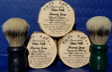 We also offer a selection of hand thrown soap dishes and mugs (shown at left) made for us by Buck Run Pottery. Boar bristle shaving soap brushes with choice of green or white handles are also available in very limited quantities.